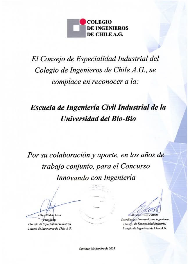 La Escuela de Ingeniería Civil Industrial de la Universidad del Bío-Bío recibió un reconocimiento por parte del Colegio de Ingenieros de Chile A.G., destacando su colaboración y compromiso permanente en el desarrollo del Concurso Innovando con Ingeniería, instancia que moviliza a estudiantes de todo el país en la búsqueda de soluciones innovadoras para desafíos reales de la ingeniería.